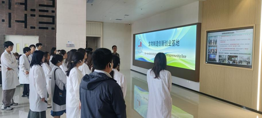 在天津国际生物医药联合研究院,同学们来到了习近平总书记曾经来过的地方,聆听了工作人员对研究院概况、研究成果的介绍,再一次看到了生产制造的机器,拓宽了同学们对生物医药领域的认知视野。
