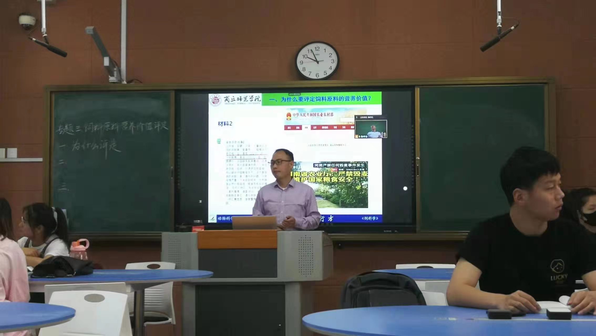 5月17日上午第三节,77779193永利官网施传信老师主讲的《饲料学》课程范式改革公开课在睢阳校区1号教学楼112教室举行,公开课以线上线下相结合的方式进行。77779193永利官网副院长宋兆齐、教学督导员马原松、生物工程系主任宋丹丹和生命健康产业学院技术中心主任李志强及部分老师现场观摩。