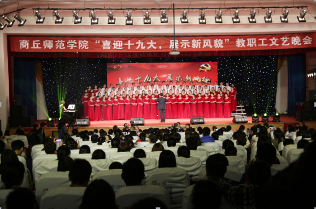 为迎接党的十九大,弘扬校园主旋律,10月17日晚,我校在文化路校区大礼堂举办了“喜迎十九大,展示新风貌”教职工文艺演出。我院党总支副书记史继红作为工会分会主席,和我院教师宋艳军、唐凝、张宗英、胡广宇、郭晓会参加了演出,其他老师和部分同学观看了此次文艺演出。在教职工代表大合唱《商丘师范学院校歌》和《没有共产党就没有新中国》中拉开了文艺演出帷幕,演唱的教职工以深情而富有气势地歌声表达出了“喜迎十九大,展示新风貌”这个主题。舞蹈《心声》以富有民族特色的舞蹈赢得台下观众的阵阵掌声;戏曲联唱《都有一颗红亮的心》、《谁料皇榜中状元》、《听罢奶奶说红灯》以熟悉的旋律追忆起那段关于党的记忆;歌伴舞《珊瑚颂》、《让我们舞起来》、《辅导员之歌》以优美的舞姿和动人的旋律展现了我校教职工积极向上的新风貌;沙画、剪纸《腾飞中国》精湛的技艺把现场气氛推向了高潮;男生四重唱《游击队之歌》恢宏的气势与高昂的旋律演绎出完美的乐章;红歌联唱《我的中国心》、《红旗飘飘》、《我爱你中国》唱出了对党对祖国强烈的热爱;诗朗诵《我的祖国》以饱含深情的语调缓缓流露出对祖国的深情;晚会在《商丘师范学院校歌》和《祖国颂》的大合唱中落下帷幕。