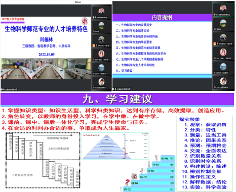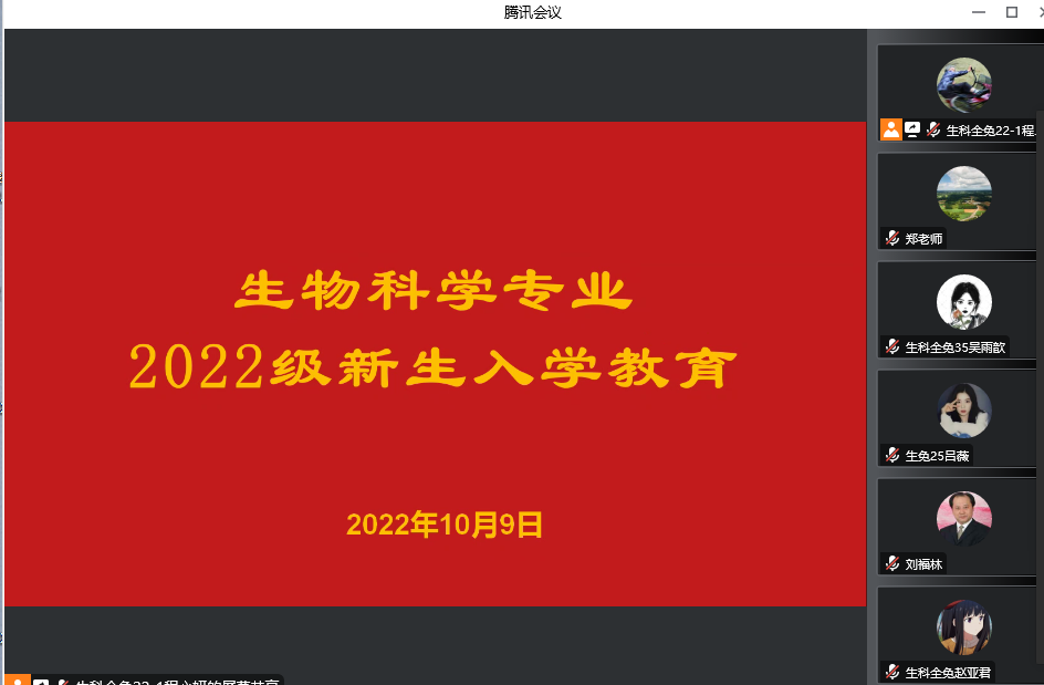10月9日晚上7-9点,生物科学系,借助于腾讯会议,召开了生物科学专业2022级新生入学教育大会。参加会议的有刘福林教授、生物科学专业2022级新生及他们的班主任。会议由系主任郑爱珍主持。